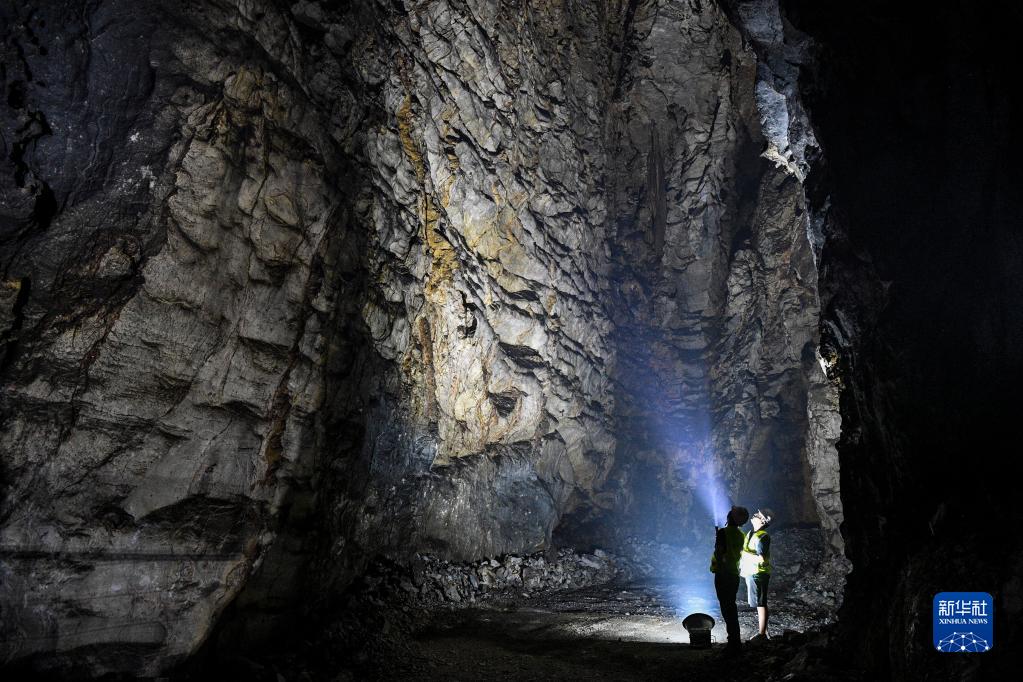 8月3日,在位于廣西環江毛南族自治縣的貴南高鐵大方山隧道內,技術人員在查看施工中發現的溶洞。