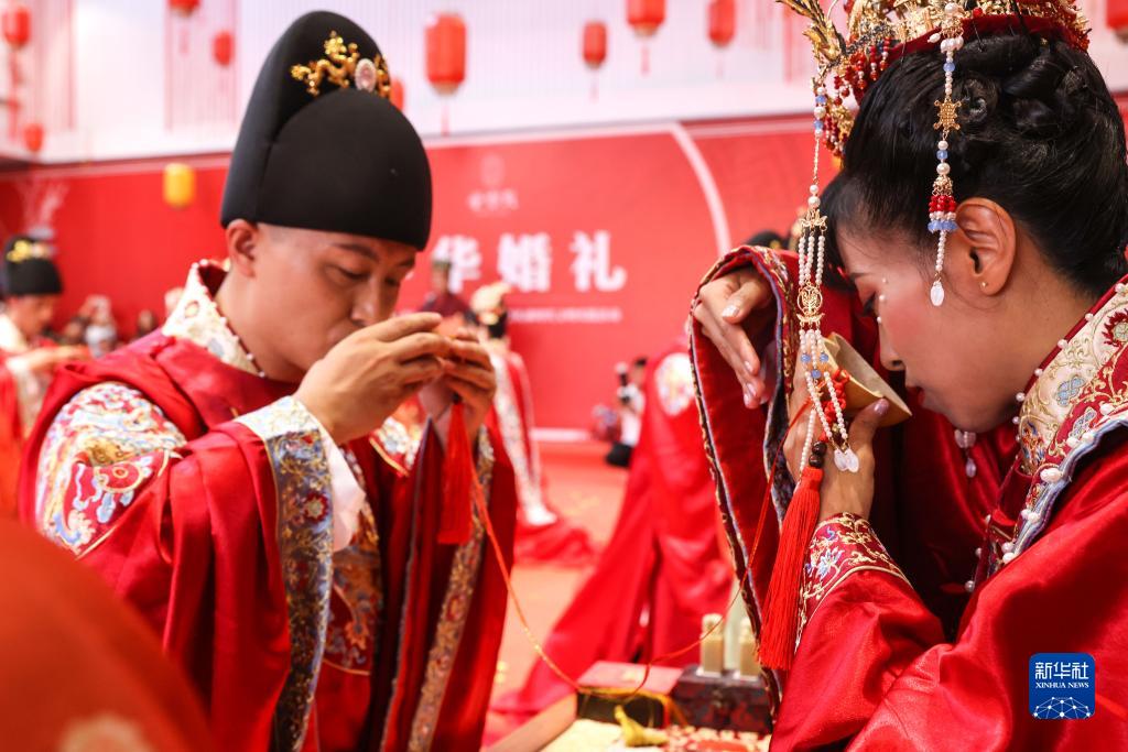 當日是七夕,2022(壬寅)年貴陽孔學堂中華婚禮在貴陽孔學堂舉辦,12對新人身穿中式婚服通過合巹禮、解纓結發、共書婚帖等方式完成傳統婚禮儀式。