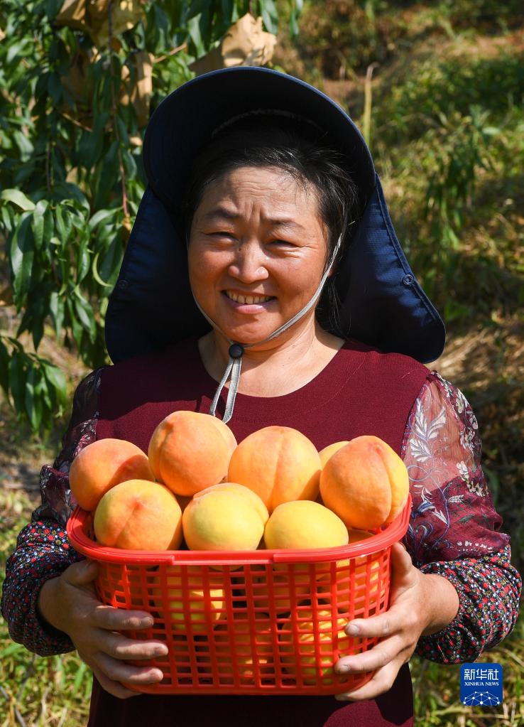 8月3日,重慶市萬州區恒合土家族鄉鴻鳳村村民展示剛采摘的桃子。