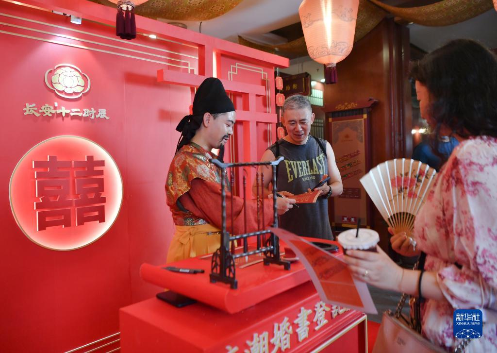 8月4日,演員(左)在“長安十二時(shí)辰”主題街區(qū)向游客贈(zèng)送“婚書”。
