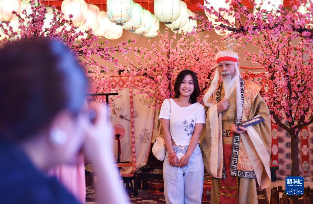 8月4日,游客在“長安十二時辰”主題街區與扮演“月老”的演員(右)合影。