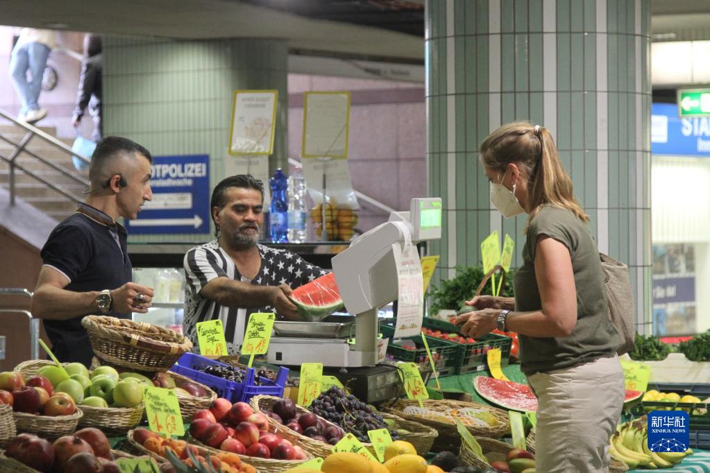 8月2日,顧客在德國法蘭克福一家攤位前購買水果。