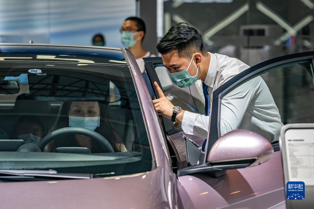 8月4日,工作人員(右)在第23屆中國(昆明)國際汽車博覽會上向參觀者介紹展車。