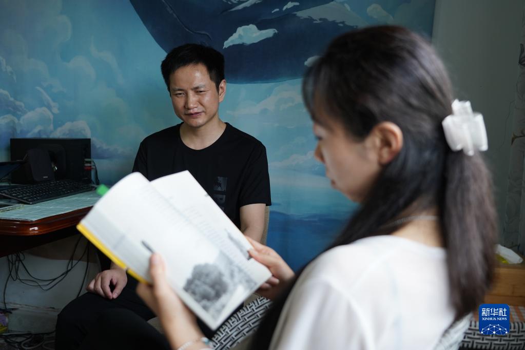 在四川省什邡市馬井鎮(zhèn)同心村,宇曉為王忠禮讀書(8月2日攝)。