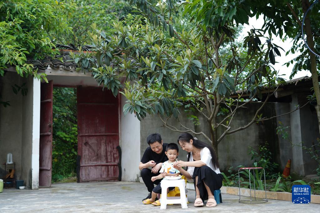 8月2日,在四川省什邡市馬井鎮(zhèn)同心村,王忠禮和宇曉陪兒子在院中玩耍。