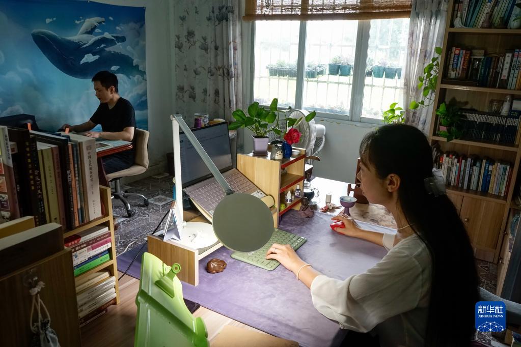在四川省什邡市馬井鎮(zhèn)同心村,王忠禮和宇曉在家中工作(8月2日攝)。