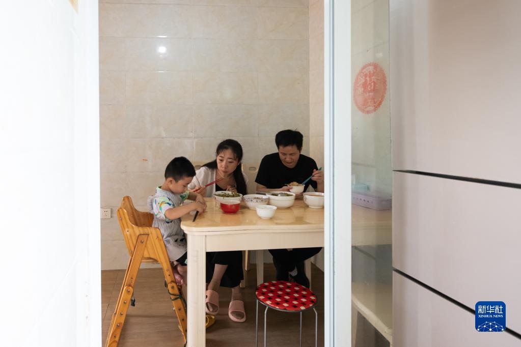 在四川省什邡市馬井鎮同心村,王忠禮、宇曉和兒子在家中吃飯(8月2日攝)。