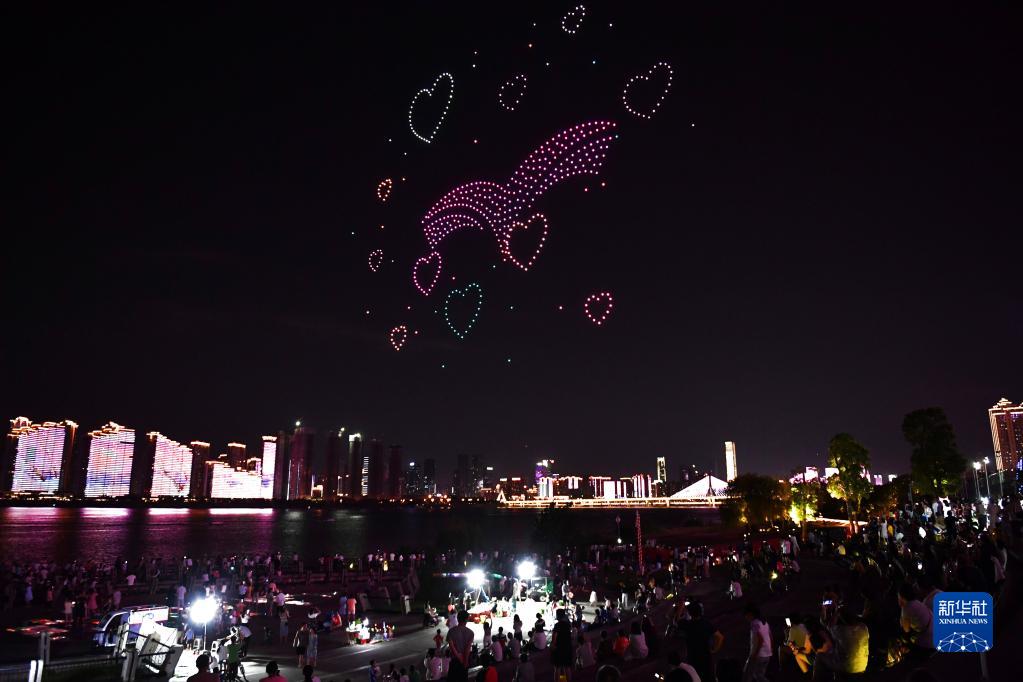 當日是七夕節,一場無人機光影秀在湖南省長沙市湘江畔上演,吸引市民駐足觀看。