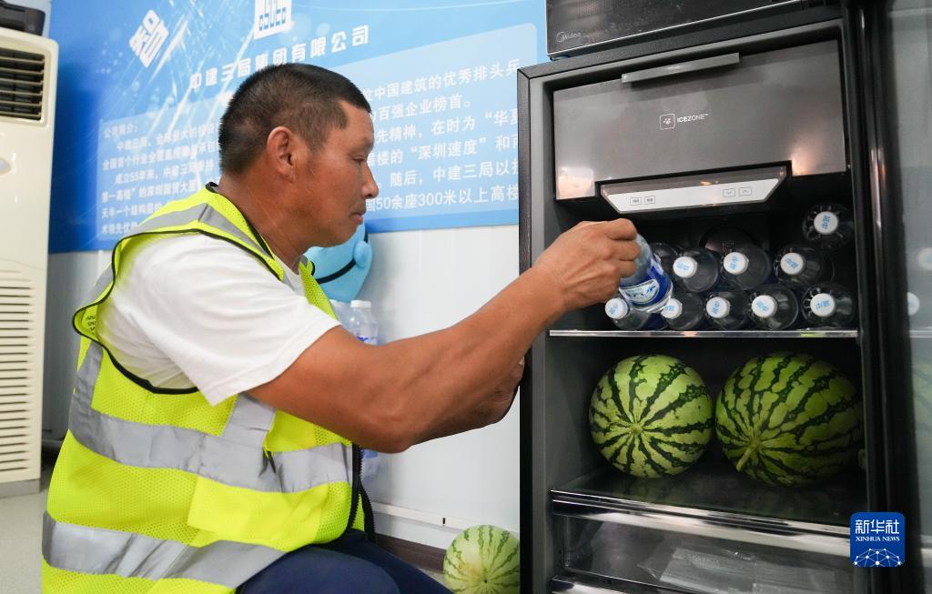 8月5日,在位于上海的一項目工地工友服務點,中建三局華東公司上海分公司的工人在取用冰箱內的免費飲品。