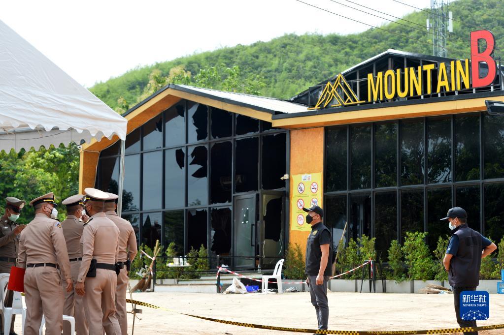 8月5日,在泰國春武里府梭挑邑地區,警察在發生火災后的夜總會外執勤。