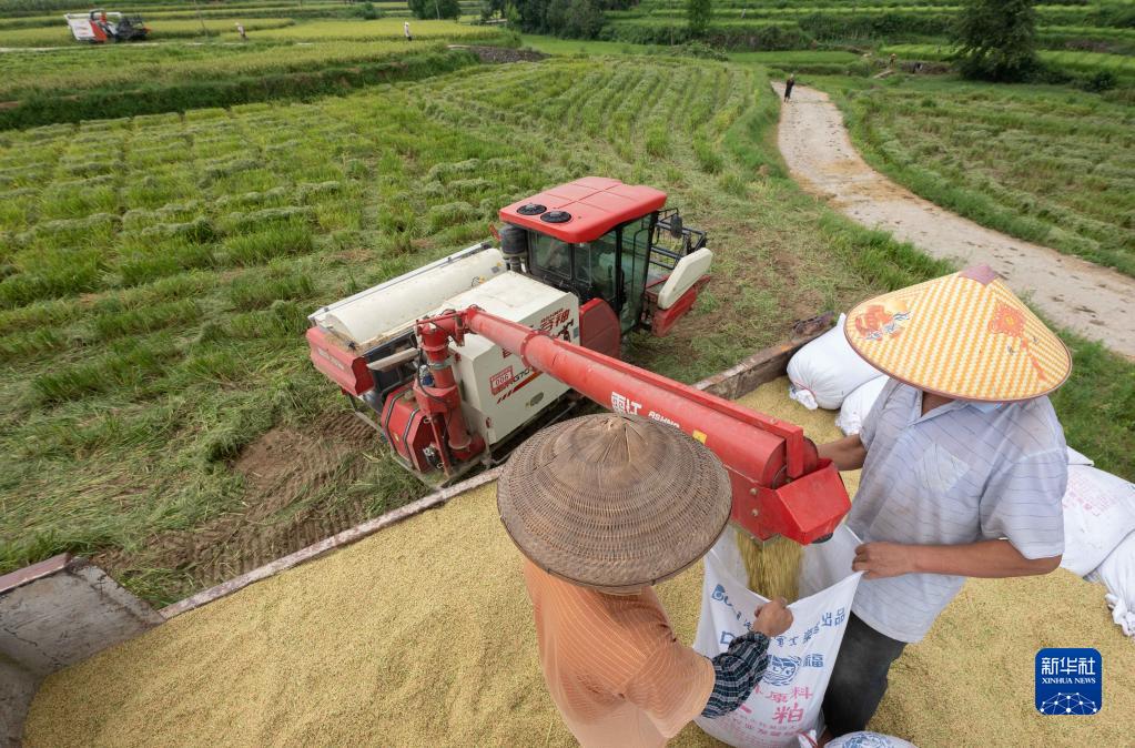 8月5日,農民在貴州省銅仁市萬山區魚塘鄉江屯村的田間收獲早稻。