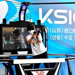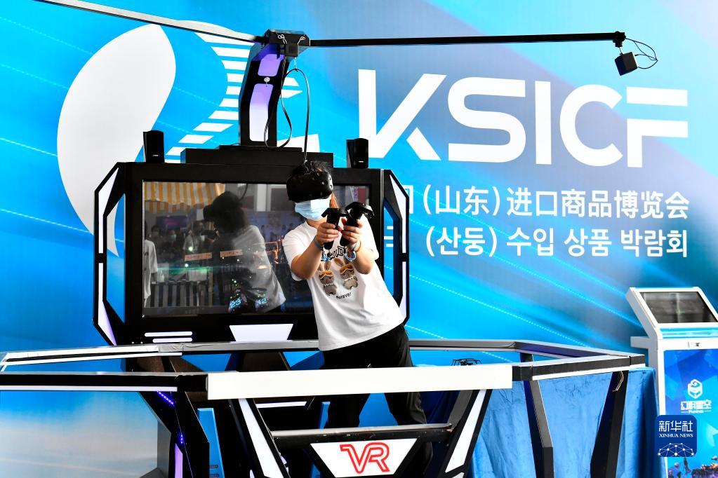 8月5日,在山東省威海市,參觀者在第二屆韓國(山東)進口商品博覽會上體驗VR游戲。
