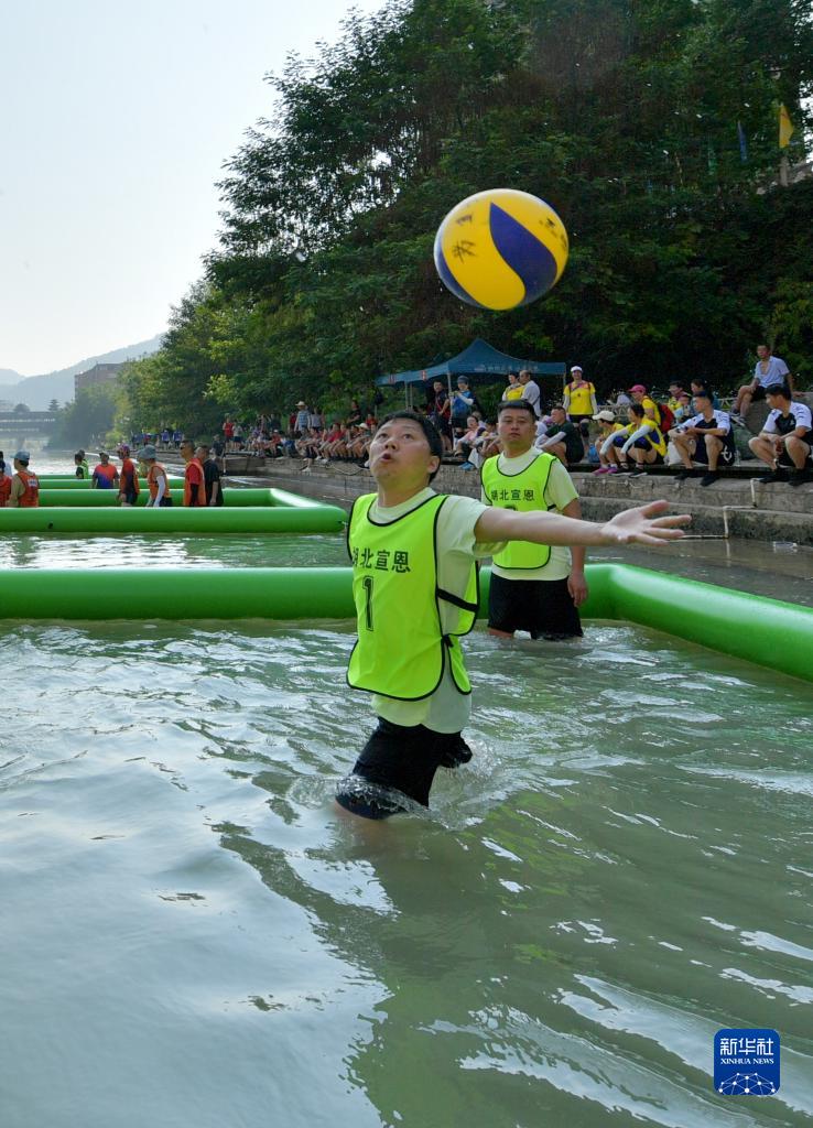 近日,湖北省宣恩縣在當地仙山貢水旅游區的貢水河上舉行水上運動會。別具一格的“水上排球”項目吸引了眾多市民和游客參加比賽,享受水上趣味運動帶來的歡樂。
