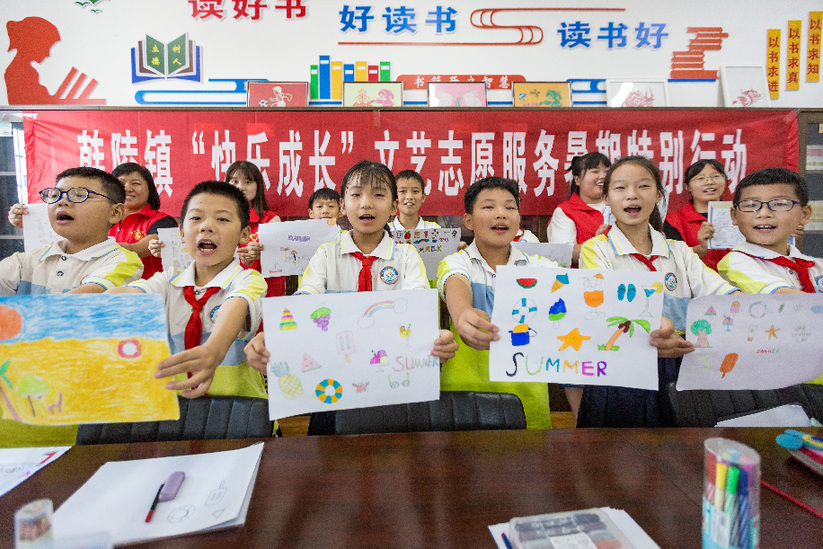 安陽縣組織53名返鄉大學生在新時代文明所(站)、鄉村復興少年宮開展了“快樂成長?”文藝志愿服務暑期特別行動,通過繪畫、籃球、歌曲、舞蹈、手工、象棋、經典誦讀等活動,教育和引導少年兒童立志向、有夢想,塑造陽光、自信、勇敢等良好品德行為,在潛移默化中提高孩子們的藝術素養,促進其全面發展和健康成長。新華網發(王建安 攝)