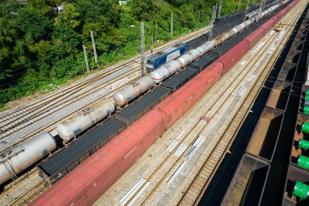 8月5日,滿載電煤的列車駛入湖南株洲北站(無人機照片)。
