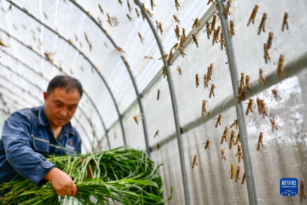 8月3日,在貴州省臺江縣臺盤鄉棉花村,駐村干部在給螞蚱投放草料。