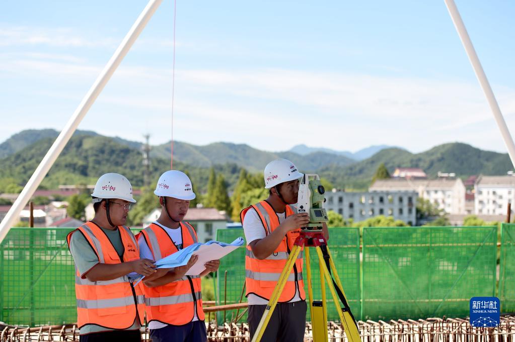 8月6日,測(cè)量人員在中鐵十一局池黃鐵路墩上特大橋系桿拱施工現(xiàn)場(chǎng)對(duì)拱體進(jìn)行數(shù)據(jù)監(jiān)測(cè)。