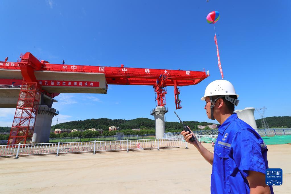 8月6日,中鐵九局工程技術人員在現場溝通箱梁架設情況。