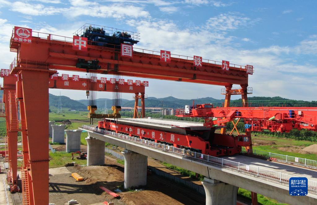 8月6日拍攝的沈白高鐵首孔箱梁架設現場(無人機照片)。