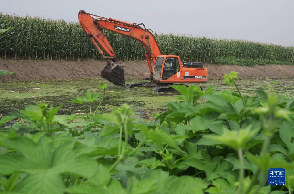 8月6日,工人在昌黎縣新集鎮境內的引灤河水灌渠清淤現場施工。