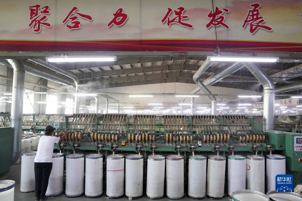這是8月4日在穆棱經濟開發區黑龍江紅豆杉亞麻紡織有限公司車間拍攝的生產場景。