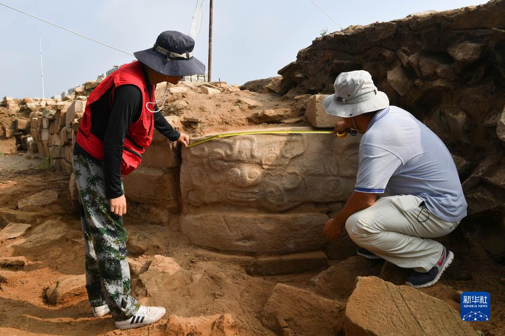 8月6日,考古人員對陜西神木石峁遺址皇城臺新近出土的石雕進行測量。