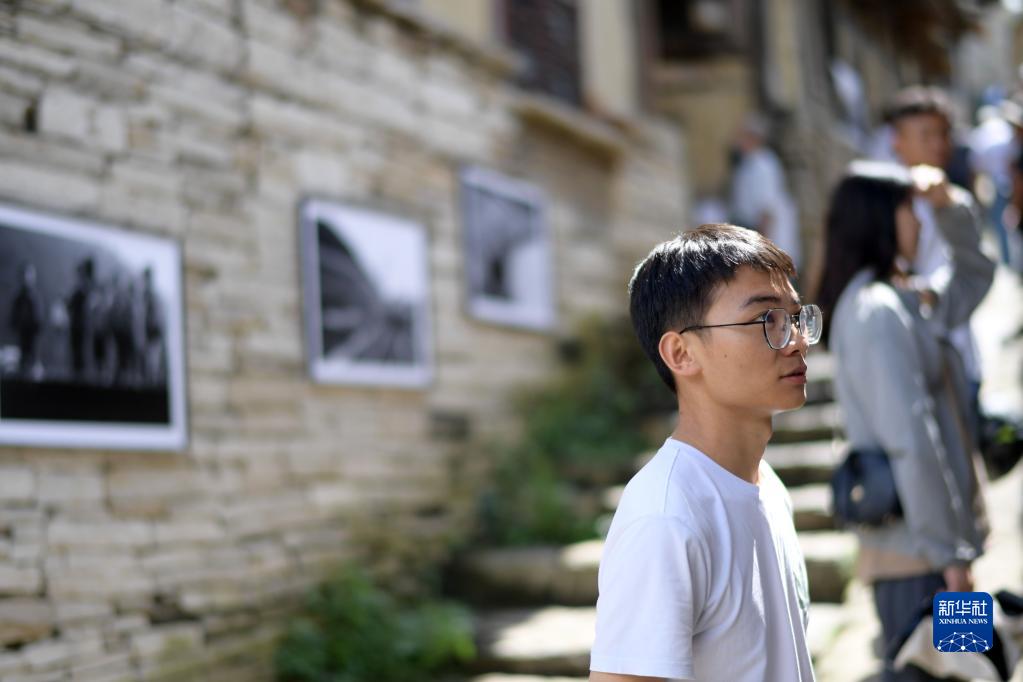 8月6日,游客在貴陽市花溪區石板鎮鎮山村“鎮山國際影像周”影展上觀展。