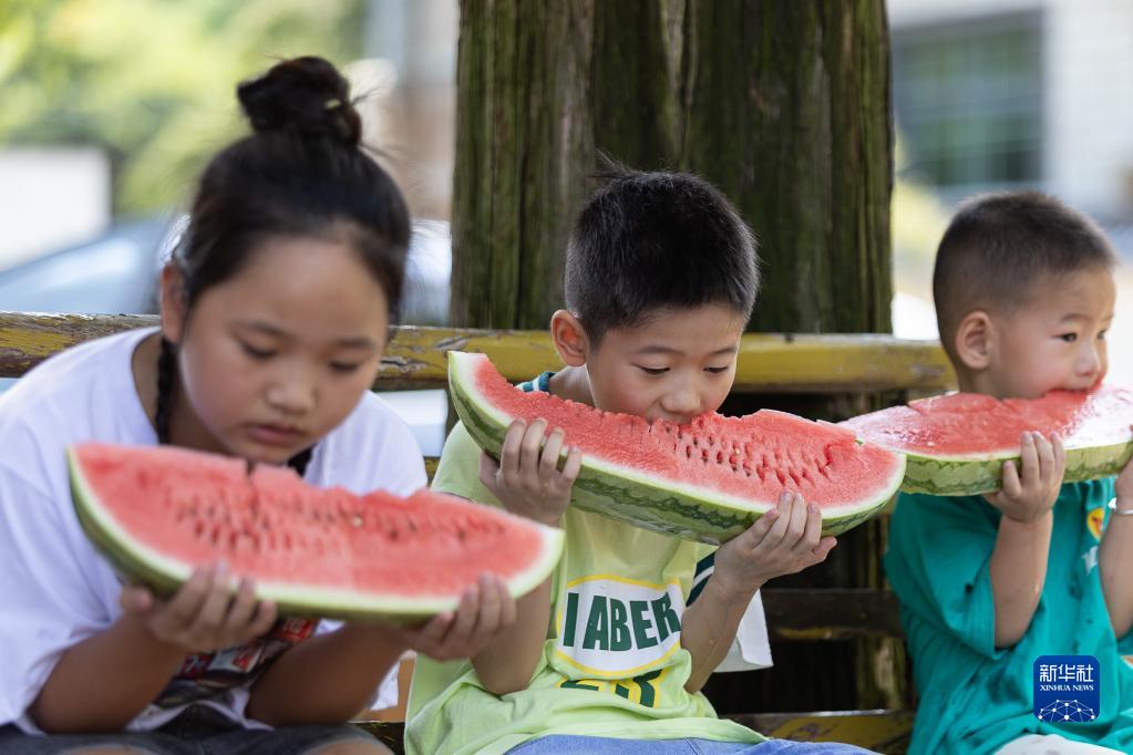 8月6日,在浙江省湖州市長興縣和平鎮(zhèn)琛磧村,孩子們?cè)诔晕鞴稀翱星铩薄?/p>