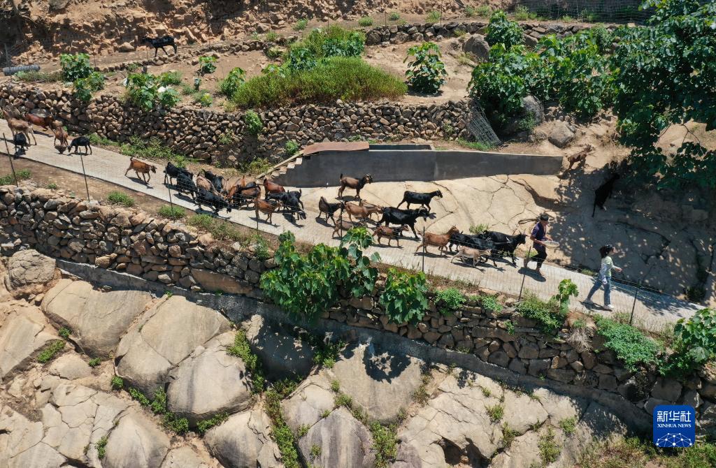 8月5日,汪淇(前)和父親行走在山羊養殖場的路上(無人機照片)。
