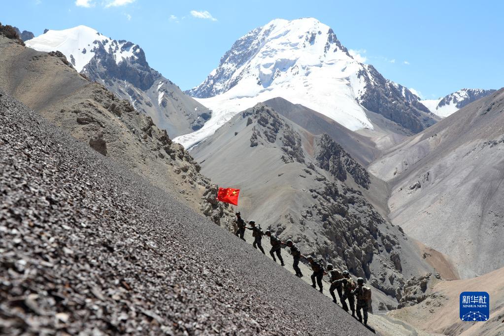 8月1日,新疆軍區(qū)庫爾干邊防連巡邏分隊官兵攀爬“刀背山”。八一建軍節(jié),解放軍和武警部隊官兵在各自戰(zhàn)位上,以軍人特有的方式慶祝中國人民解放軍建軍95周年。