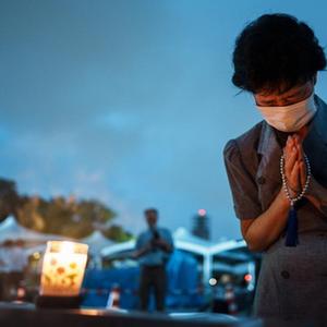 8月6日,一名女子在日本廣島和平紀念公園的和平都市紀念碑前祈禱。