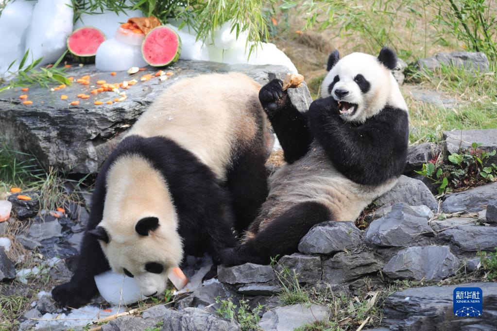 8月6日,在比利時布呂熱萊特的天堂動物園,大熊貓“寶弟”(左)、“寶妹”享用“生日大餐”。