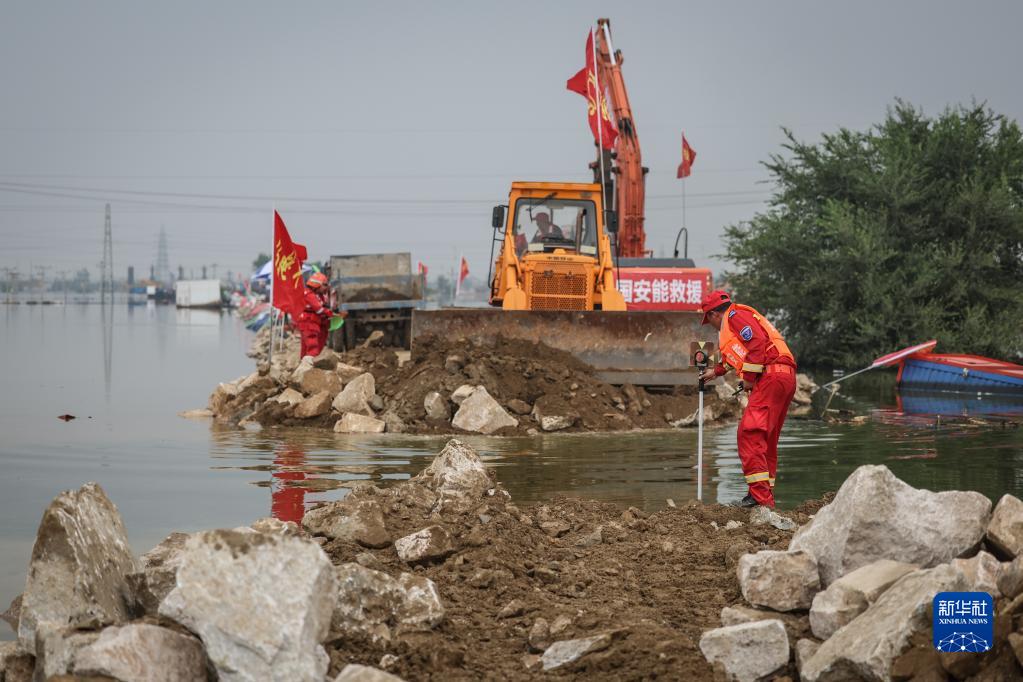 8月6日,搶險人員在潰口處進行封堵作業。