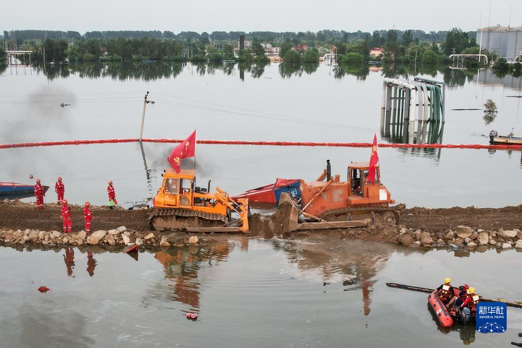 8月6日,搶險人員在潰口處完成合龍作業(無人機照片)。