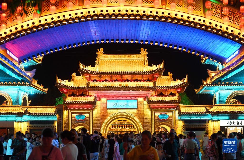 夜幕降臨,陜西省西安市周至縣水街煙火巷子燈火璀璨,街區里的特色小吃、傳統手工藝和非遺文化展演等活動吸引游人駐足。