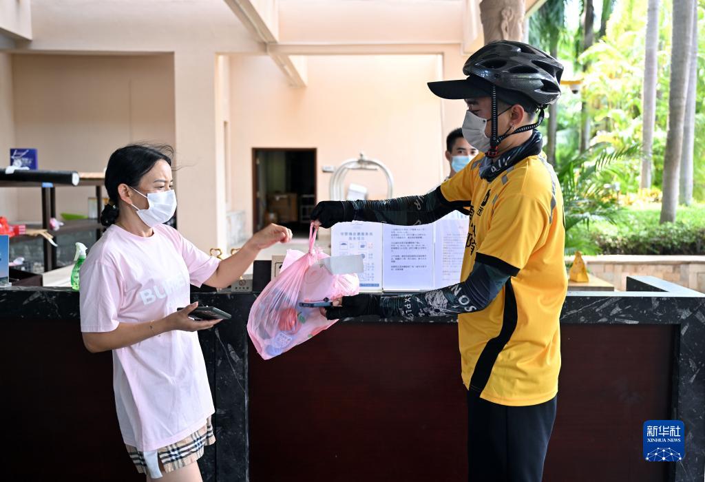 8月7日,游客在三亞一家酒店門前取外賣。