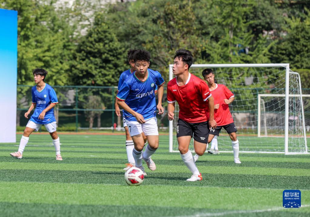 8月8日,在四川省宜賓市人民廣場體育公園,青少年在五人制足球比賽中拼搶。