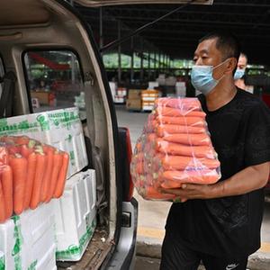 8月8日,在三亞一農副產品批發市場,工作人員在搬運從島外運來的蔬菜。