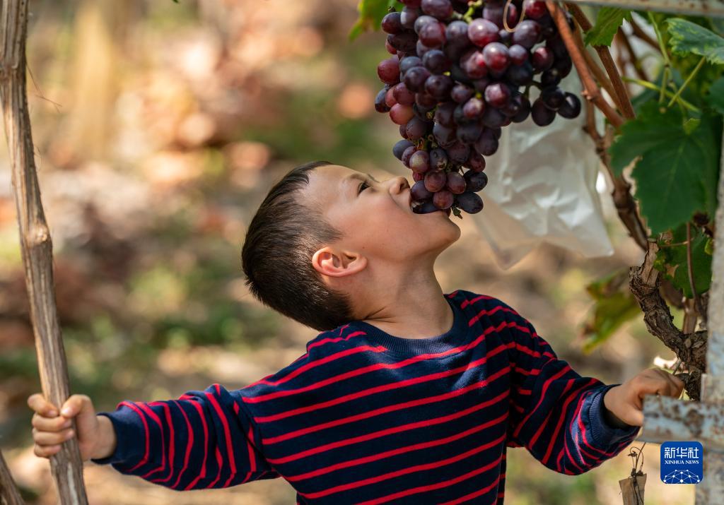 小朋友在東風農場的葡萄架下吃葡萄(8月8日攝)。