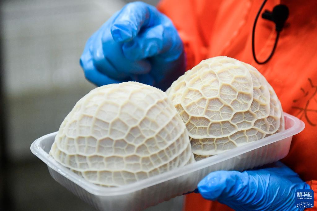 崔玉梅展示精修后待塑封冷凍的金錢(qián)肚(8月4日攝)。