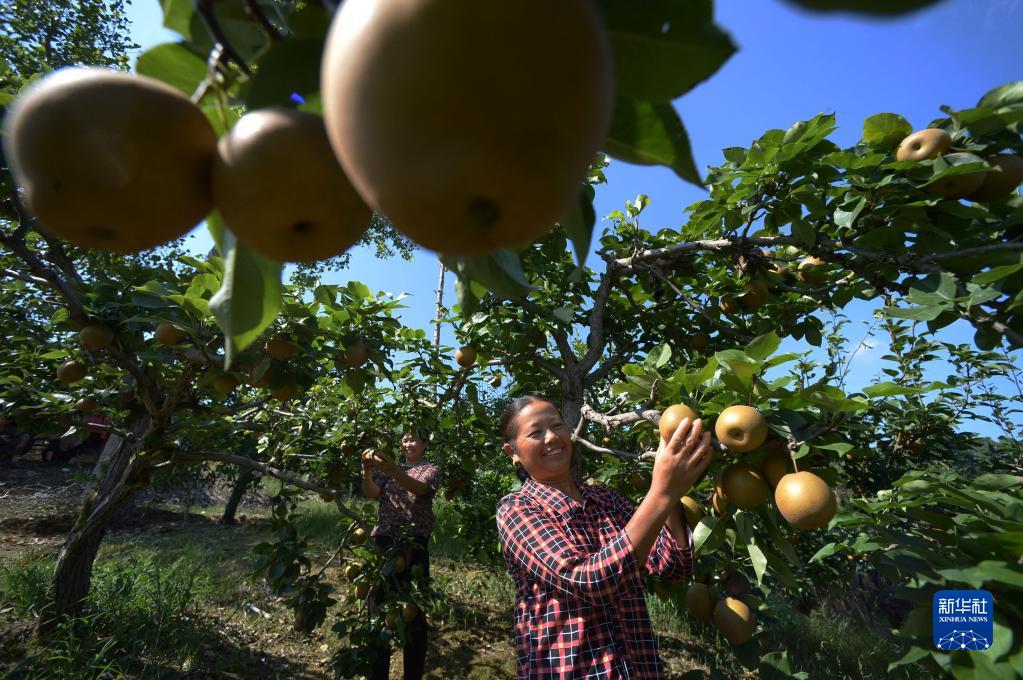 8月9日,村民在貴州省遵義市余慶縣白泥鎮明星社區果園采摘金秋梨。
