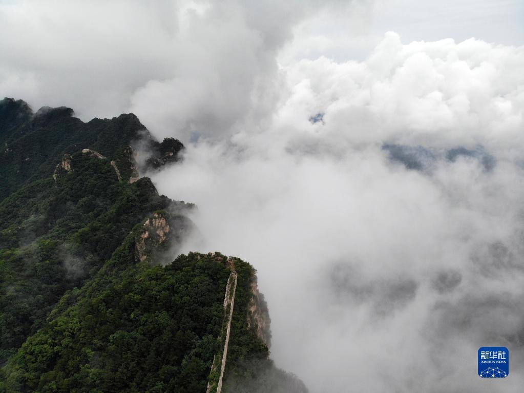 8月9日拍攝的金山嶺長城云海景觀(無人機照片)。