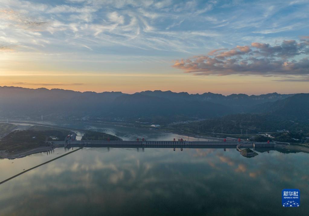 日出時分,在湖北省宜昌市秭歸縣,朝霞把長江三峽大壩裝扮得美不勝收(8月9日,無人機照片)。