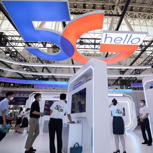 8月9日,在中國電信集團有限公司展區,工作人員在備展。
