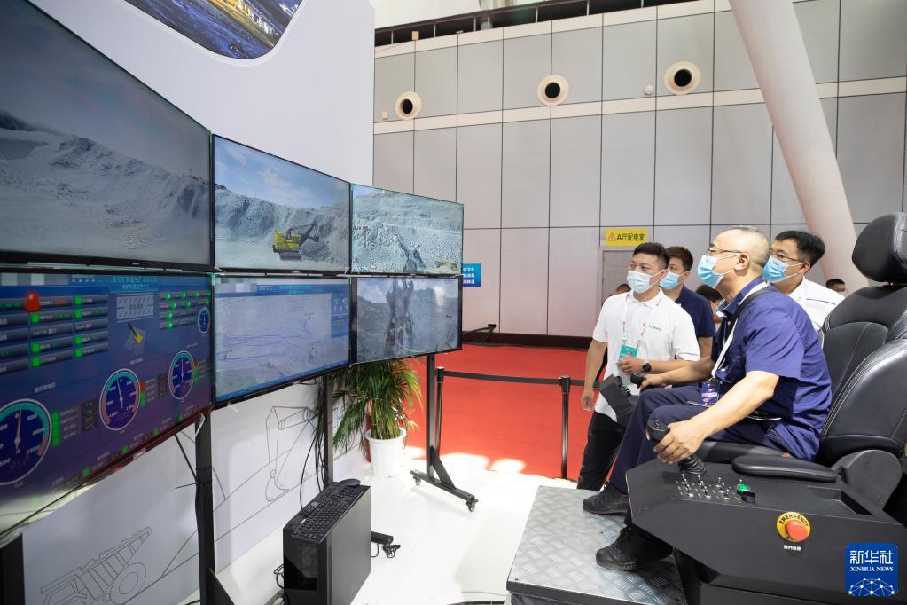 8月10日,人們在2022世界5G大會展廳里體驗5G網絡支持下的遠程采礦設備。