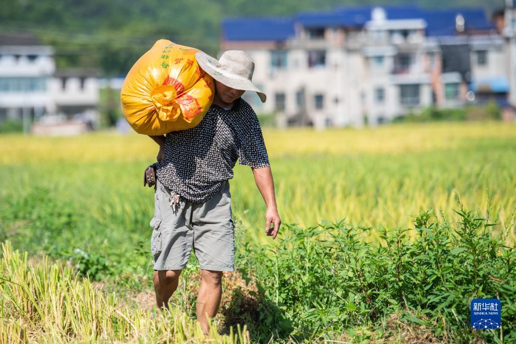 8月10日,在 “一季雜交稻+再生稻”生產(chǎn)模式寧鄉(xiāng)示范基地頭季稻測產(chǎn)驗收現(xiàn)場,工作人員搬運打包好的稻谷。