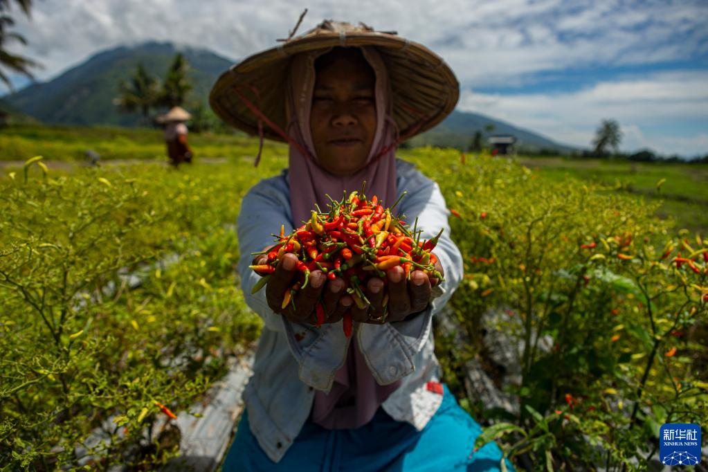 8月10日,在印度尼西亞中蘇拉威西省帕盧的辣椒地里,農民展示收獲的辣椒。