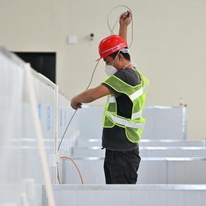 8月10日,工人在三亞第二方艙醫院作業(無人機照片)。