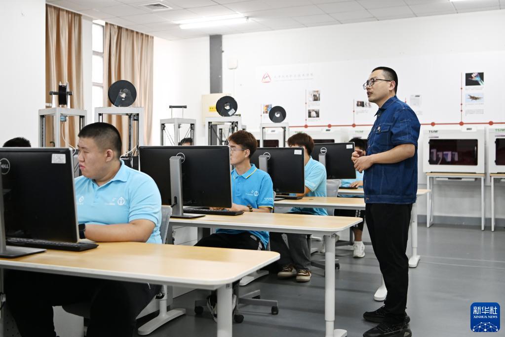 劉世雄(右一)在天津機電職業技術學院的教室內給學生講課(8月8日攝)。新華社記者 李然 攝