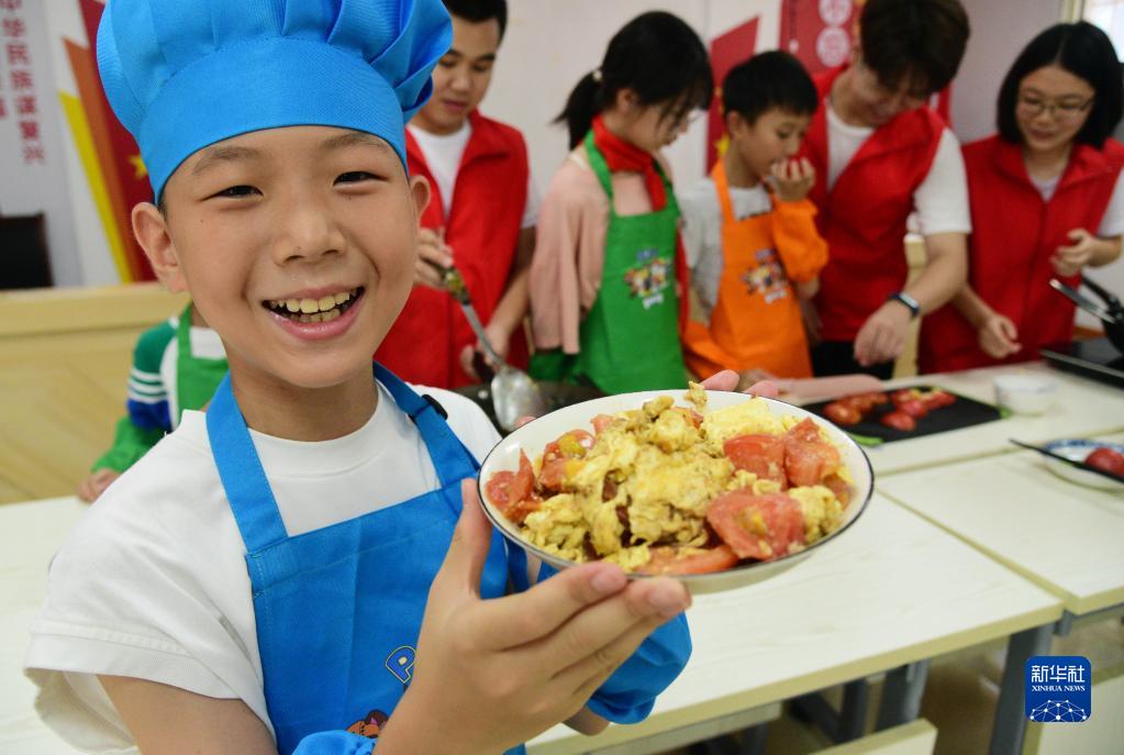 8月10日,在江蘇省鎮(zhèn)江市紅光太古山社區(qū),一名小朋友展示江蘇大學志愿者指導他烹制的家常菜。